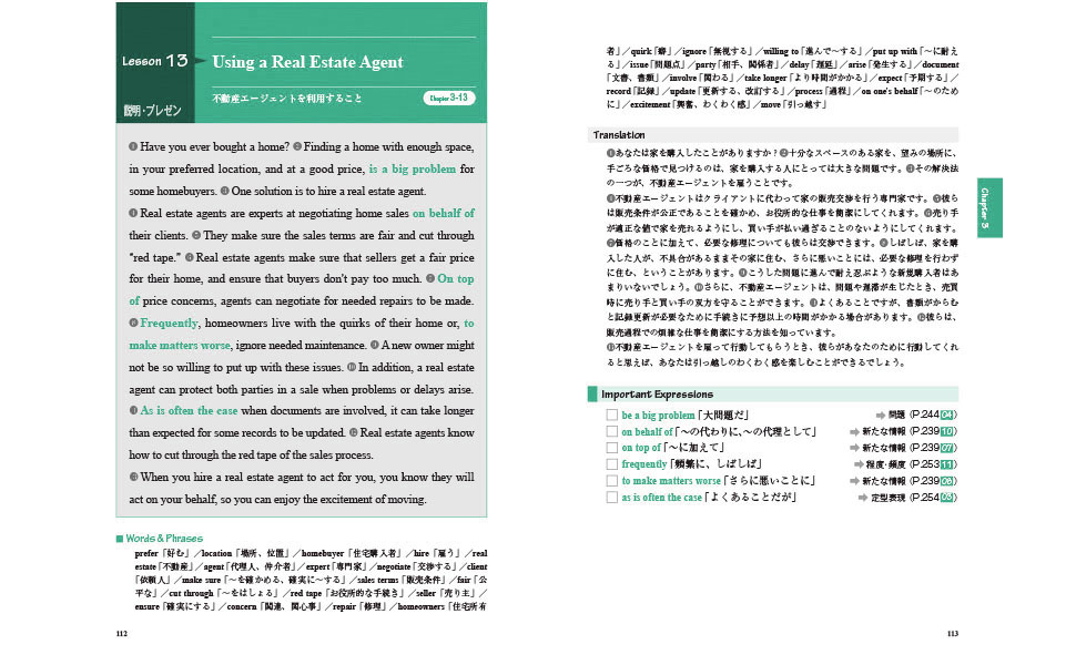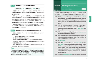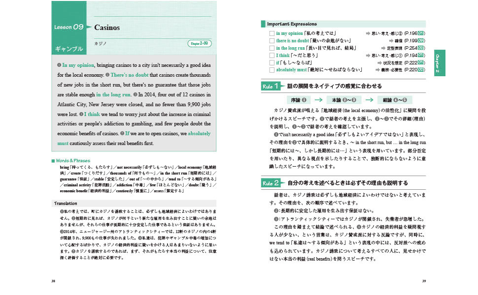 英文としては、「オリンピックの開催」「テレビゲーム」「民泊」「ディナーの準備」「大原美術館」「自動運転車」「将来の夢」「おもてなし」といった日常的な話題から、「サービスの説明」「新人研修」「金額の交渉」「売買」「販促イベントの開催」「マーケティングのキックオフ」「苦情への対応」といったビジネスシーンまでを例に挙げながら学んでいきます。
