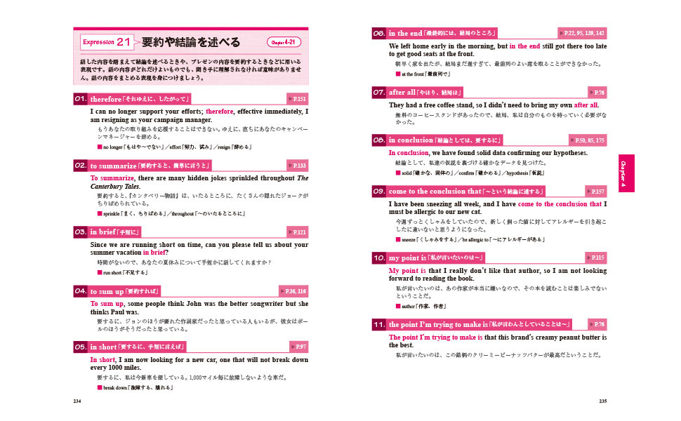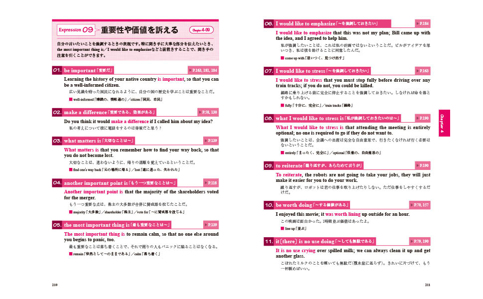 本書では、「原因・理由を述べる」「推量・判定する」「意見を述べる」「確信・疑念を抱く」「立場を表明する」「希望・願望を述べる」「義務・必要性を訴える」「心配・不安を抱く」「逆接・譲歩を表す」「目的・意図を述べる」「比較・相関する」「可能・不可能を表す」「伝聞・事実を表す」「相違・類似を表す」「順序立てて述べる」「問題点を指摘する」「要約・結論を述べる」「程度・頻度を述べる」「前置き・換言などを表す」「提案・説得する」など、きちんと伝わえたいときに用いる表現を身につけることができます。