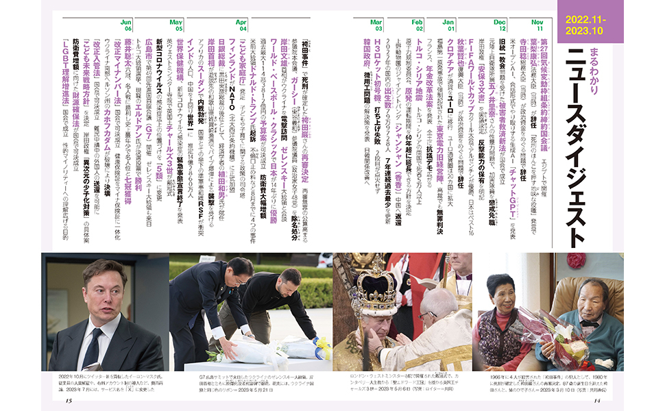 巻頭カラー「目でみてわかるニュースの大疑問」では、特に注目のテーマを詳しく掘り下げ、「まるわかりニュースダイジェスト」では、1年間の重要ニュースを時系列でおさらいできるようになっています。