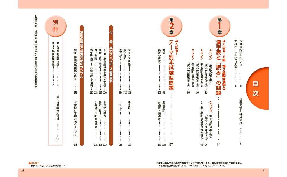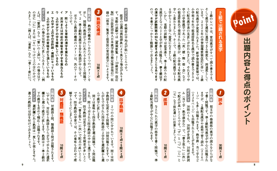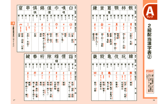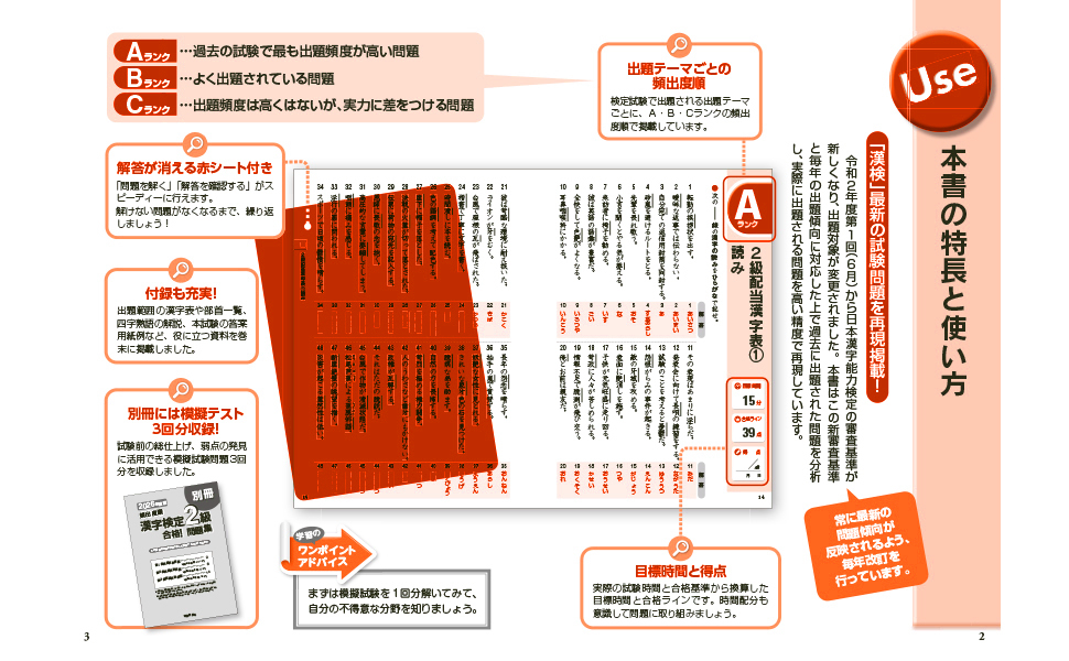 さらに、2級配当漢字をより効率よく学習できるよう、2級配当漢字の頻出度順に沿って「漢字表」と「読み」の問題を掲載。