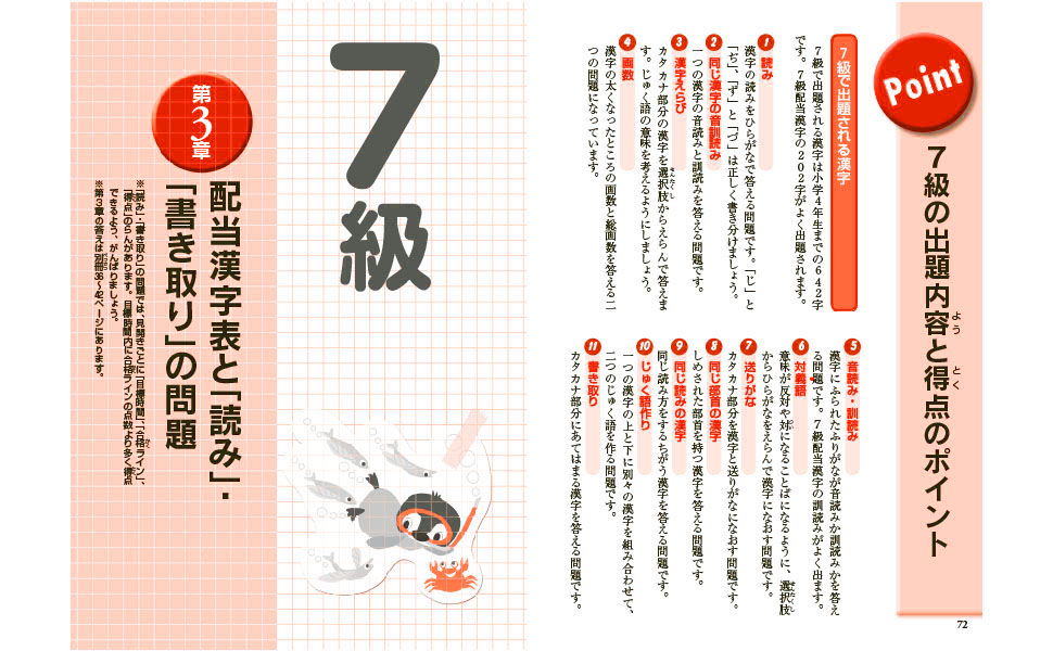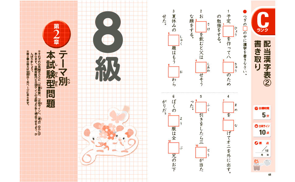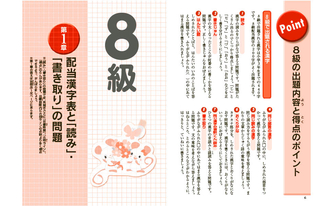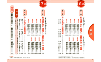 また、7・8級配当漢字をより効率よく学習できるよう、7・8級の配当漢字の頻出度順に対応させて「漢字表」と「読み」「書き取り」の問題を順に掲載。