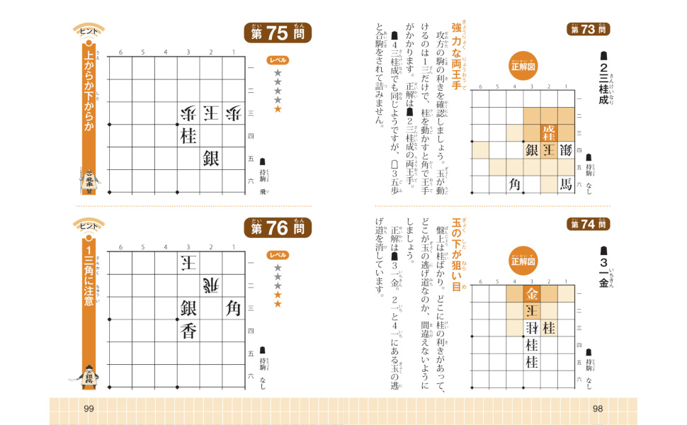詰将棋の基本ルールからていねいに説明しているので、将棋を始めたばかりの子どもでも安心。問題は5段階にレベル分けされており、将棋の楽しさを実感することができます。また、正解手順のほかにおちいりやすい失敗例も掲載し、解き方を丁寧に解説しています。
