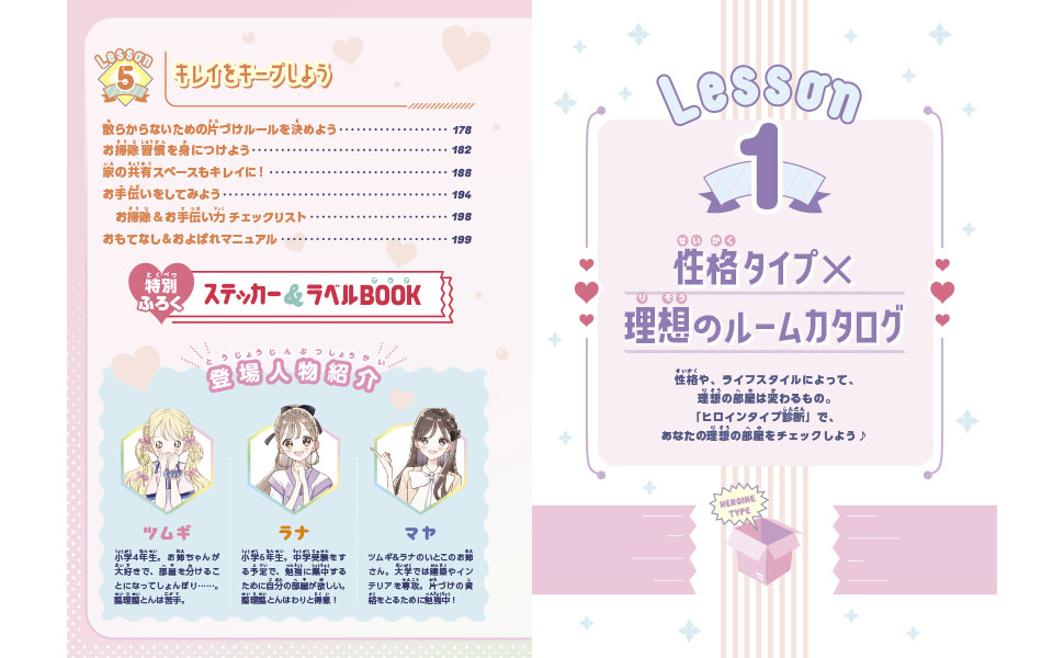 中学受験を頑張るラナ、推し活に夢中の妹・ツムギ、お部屋づくりのコツを教えてくれるマヤなど、個性豊かなキャラクターたちと一緒に、お部屋づくりと整理整頓をマスターしましょう!