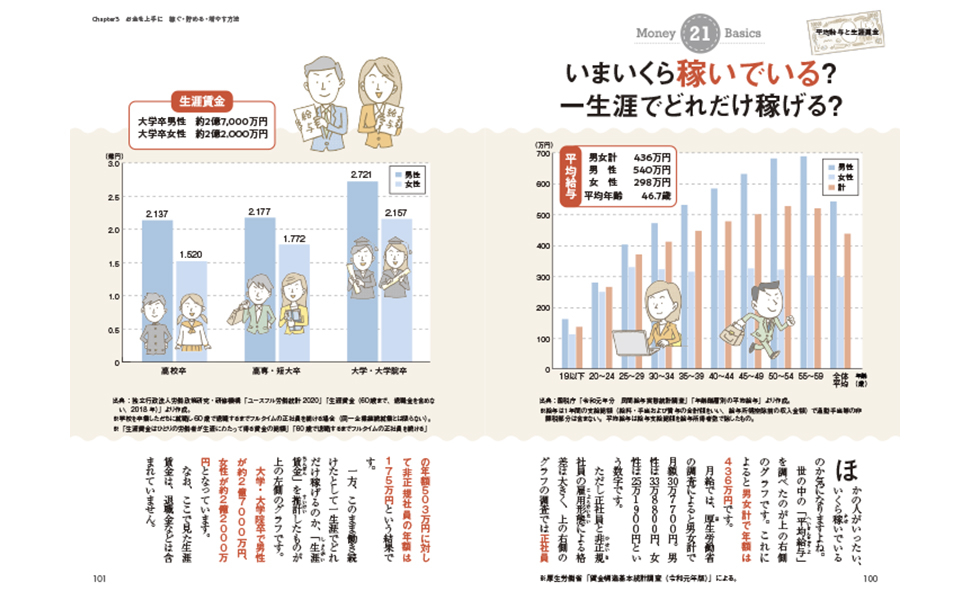 本書で理解できるのは、お金のしくみをはじめ、景気、GDP、金利、為替(円高・円安)、銀行、日本銀行、決算書、税金、社会保険(年金、健康保険)、貯める・増やす、株、FX、投信、債券、老後資金、相続、贈与、保険(生保、損保)などです。