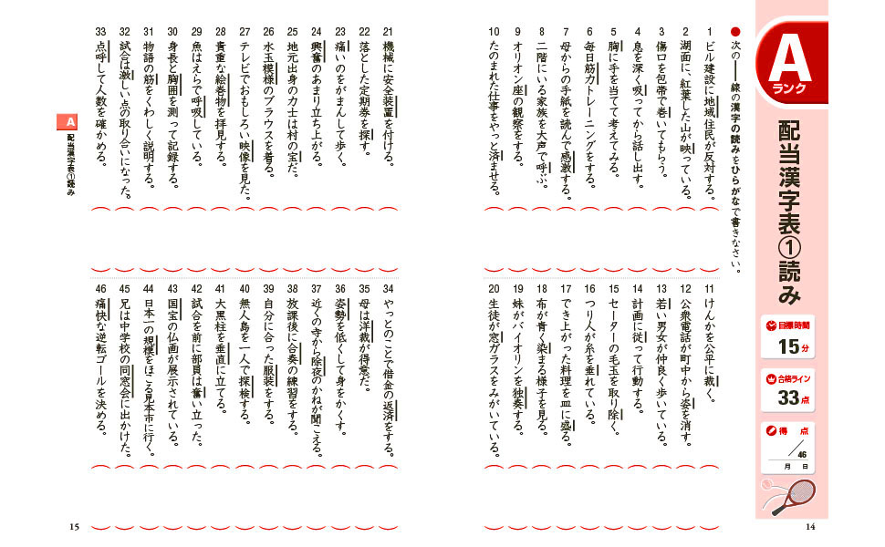 資料には、「5級以下の配当漢字表」「熟字訓」「部首一覧」などを収録、この1冊で効率よく学習できる。また、5級配当漢字をより効率よく学習できるよう、5級配当漢字の頻出度順に対応させて「漢字表」と「読み」「書き取り」の問題を順に掲載。