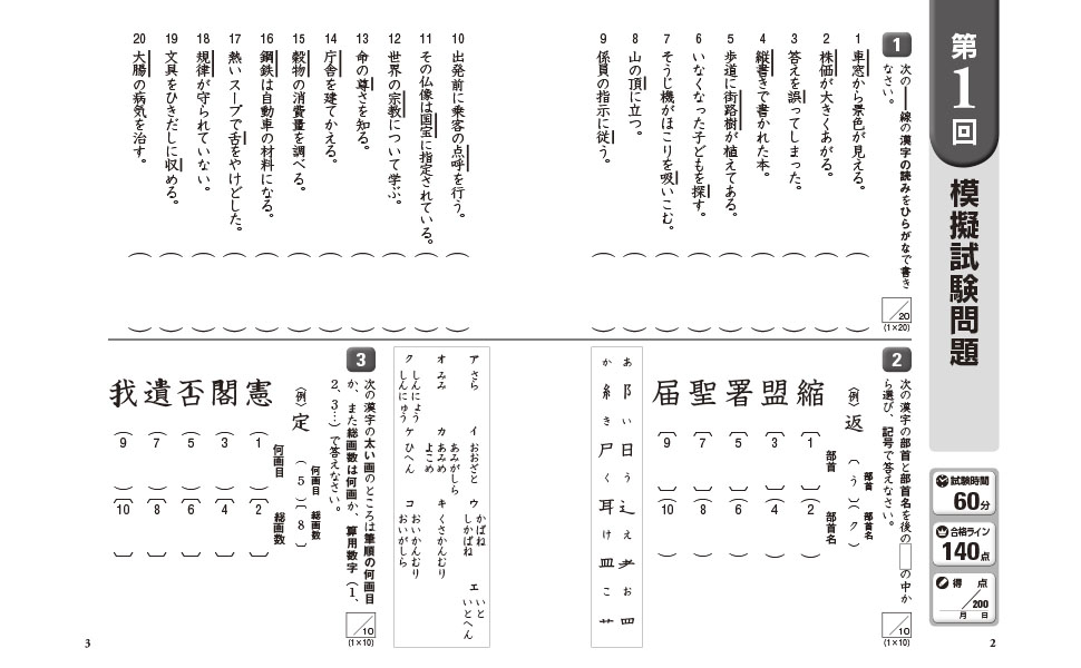 本冊(分野別問題)は過去問データを頻出度順で掲載。最新の出題形式に対応。書き込み式(解答は別冊に収録)で、枠が広くて書き込みやすい。文字が大きいので漢字のとめはねもよくわかる。別冊には、模擬試験問題3回分を収録、最新の出題形式に対応しているのはもちろん、最新の出題傾向にも対応。