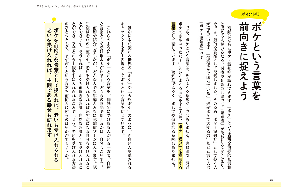 「脳・心」と「体」の両面を解説していきますが、とくに、ボケに対するポジティブな考え方、暮らし方にページを割いてます。