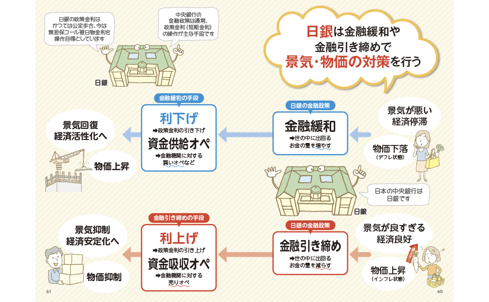 もちろん、金利を理解するために必要な、基本的な金利のしくみもイラスト図解でていねいに解説しているため、自分のモノにできます。たとえば、金利のベースにある、日銀の利上げ・利下げや金融緩和・引き締めを行う理由・目的も理解できます。