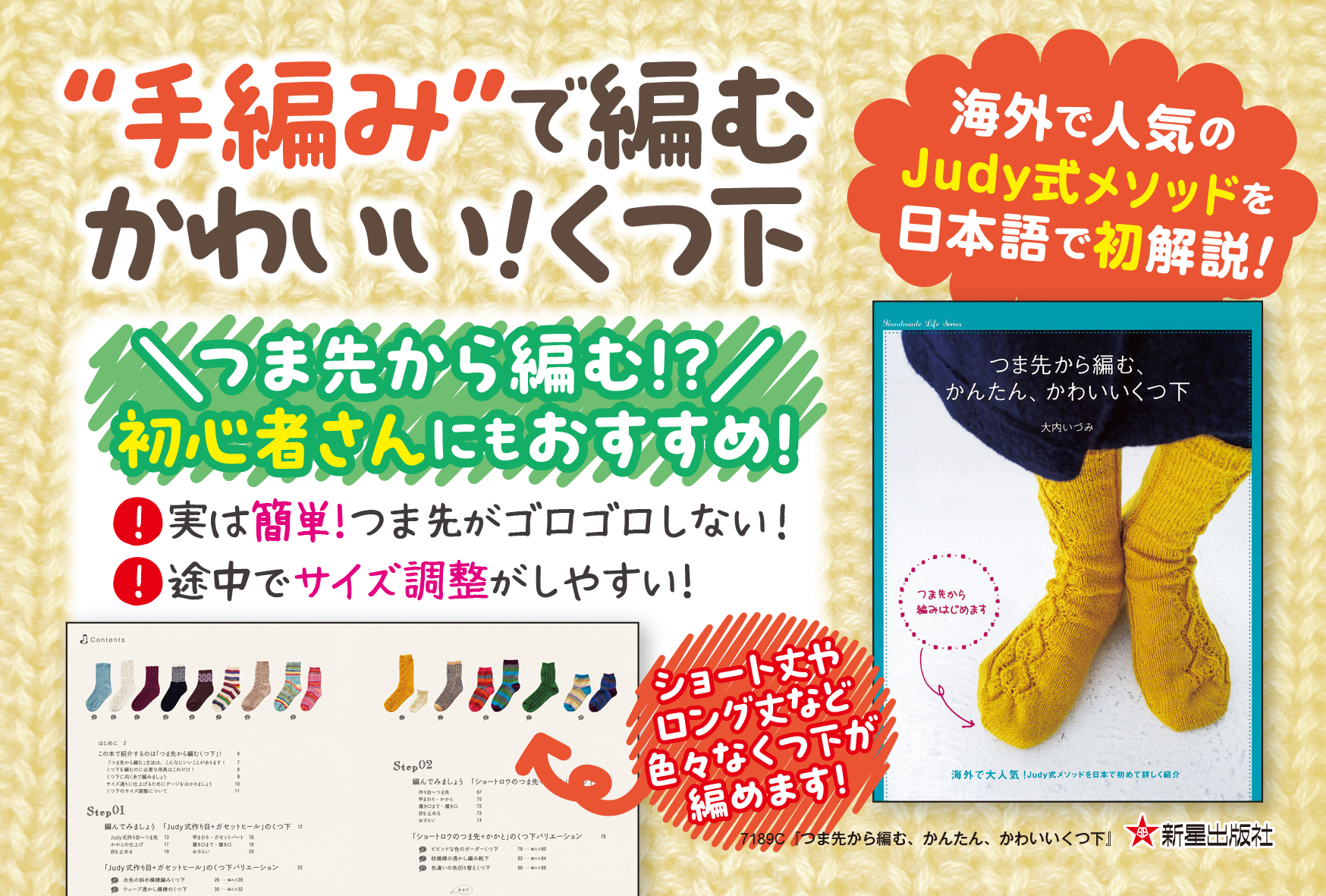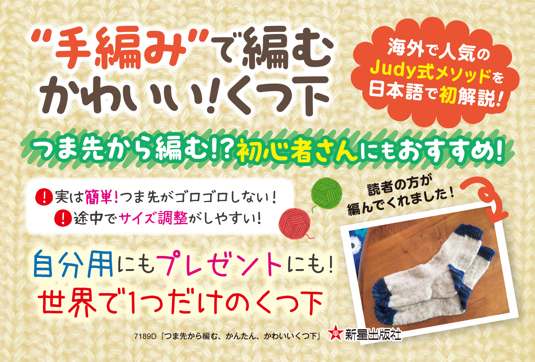 「つま先から編む、かんたん、かわいいくつ下」978-4-405-07189-6 のPOPです。